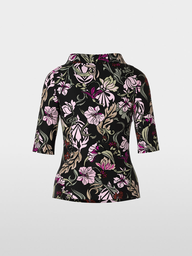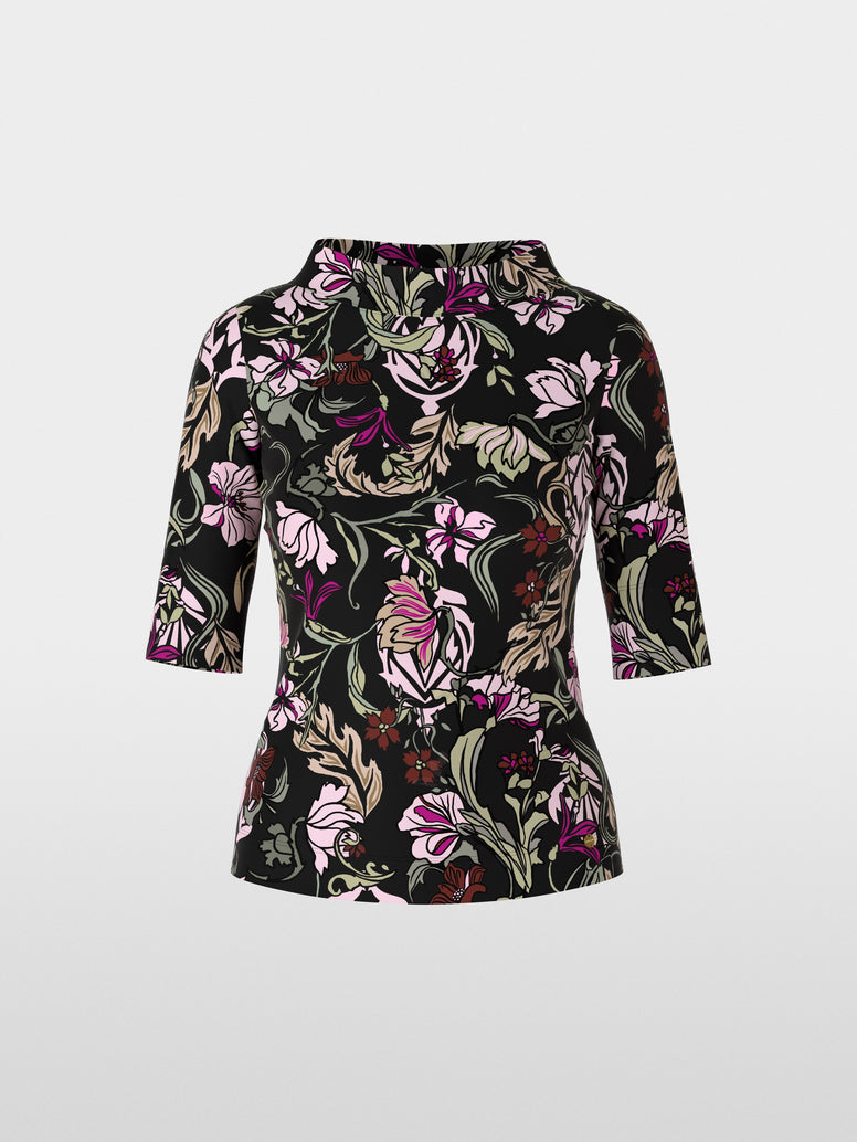 This blouse is made of sturdy ribbed cotton with elastane. It stands out with its floral print and features a fitted silhouette with three-quarter-length sleeves and small side slits. A wide stand-up collar underscores its distinctive style.