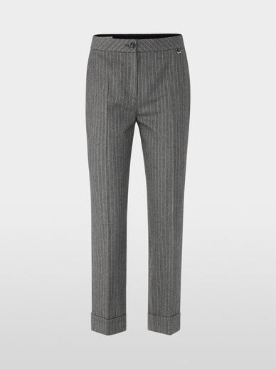 Lightweight trousers with a feminine leg. The Mc - Faracci Chino model features a regular rise, a cropped leg, and a turn-up hem. The integrated crease adds an elegant touch. The highlight is the fine stripes running in opposite directions down both legs and the waistband, giving the trousers a special charm. The model is responsibly produced and therefore carries the Rethink Together sustainability label.