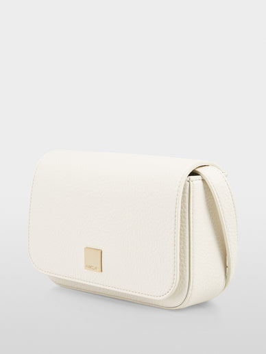 Crafted from grained, recycled leather, this shoulder bag carries the "Rethink Together" sustainability label. It features a small, rectangular silhouette. The shoulder strap is individually adjustable. The flap on the bag features a magnetic closure.