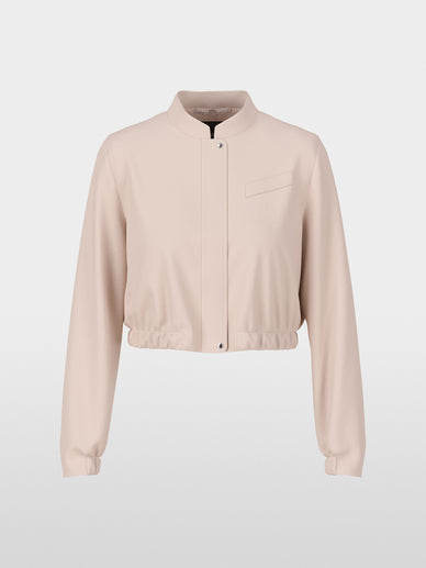 This stylish jacket comes in a loose blouson style. It's made from a stretchy, softly flowing material. Elastic cuffs and an elastic hem shape the silhouette. Signature details include a college collar and a slanted breast pocket on the left side. A two-way zipper serves as the closure.
